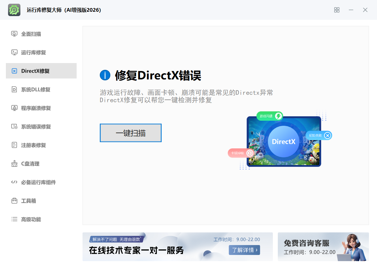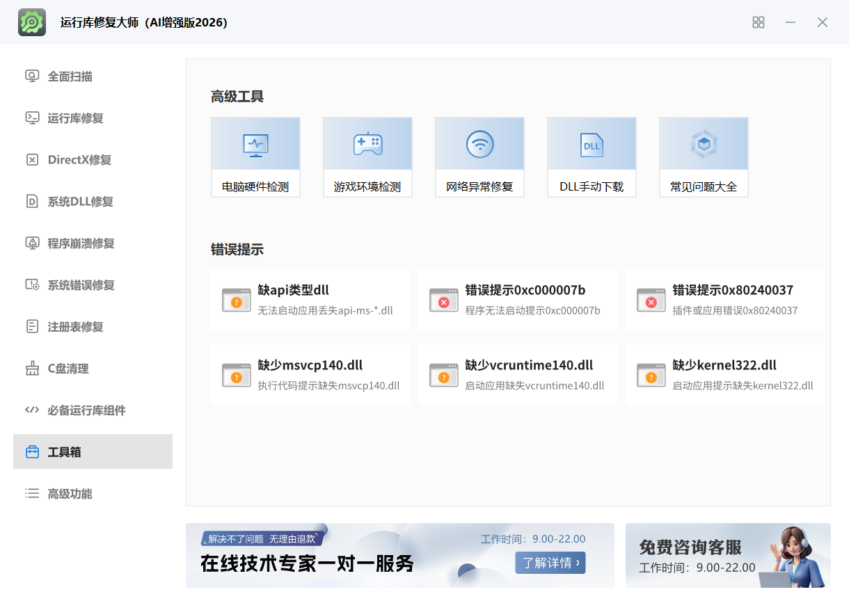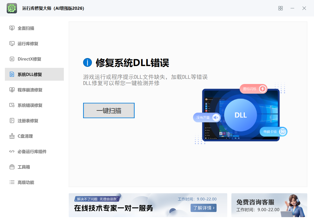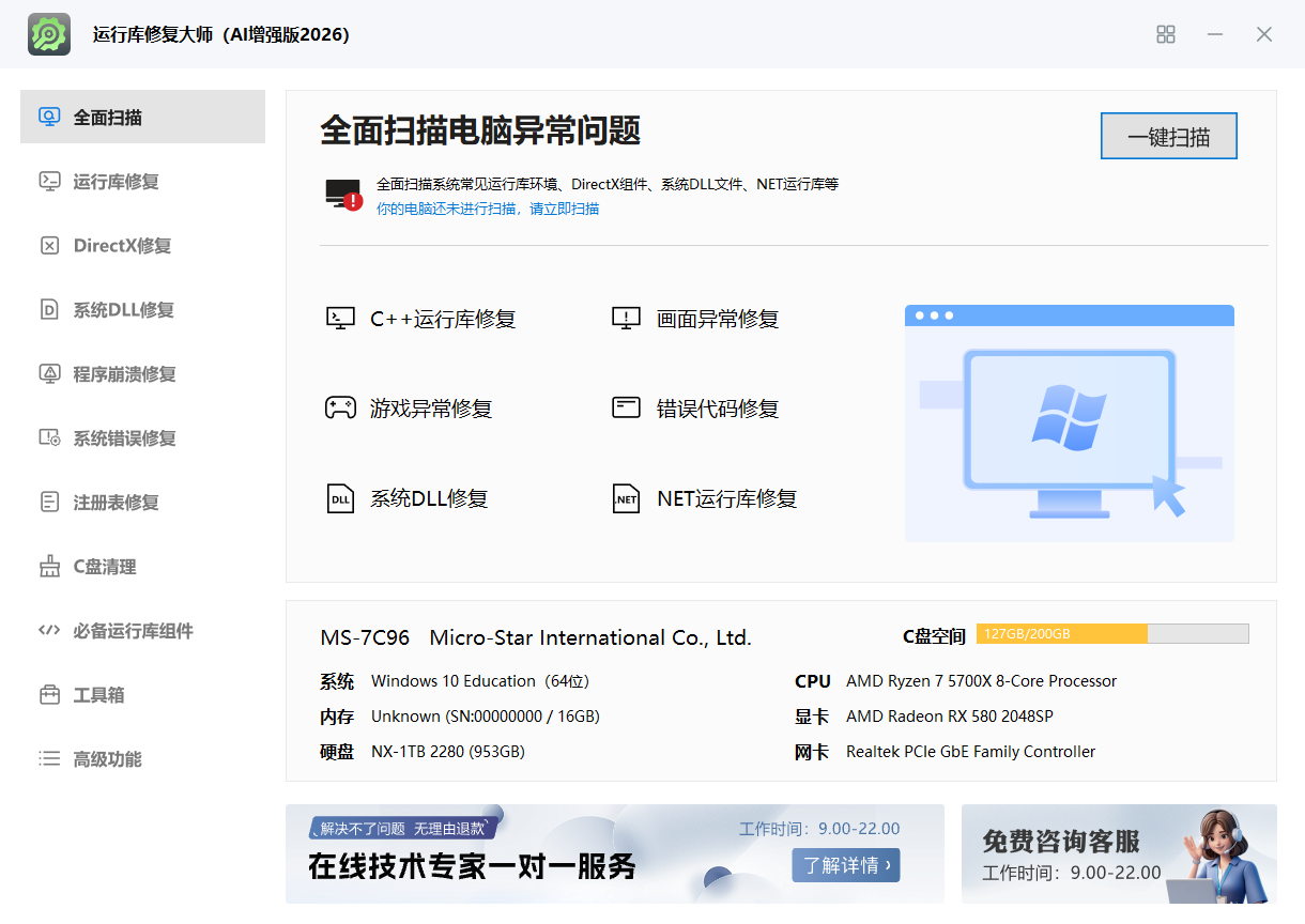 - · 自动修复系统运行环境与核心组件缺失损坏问题